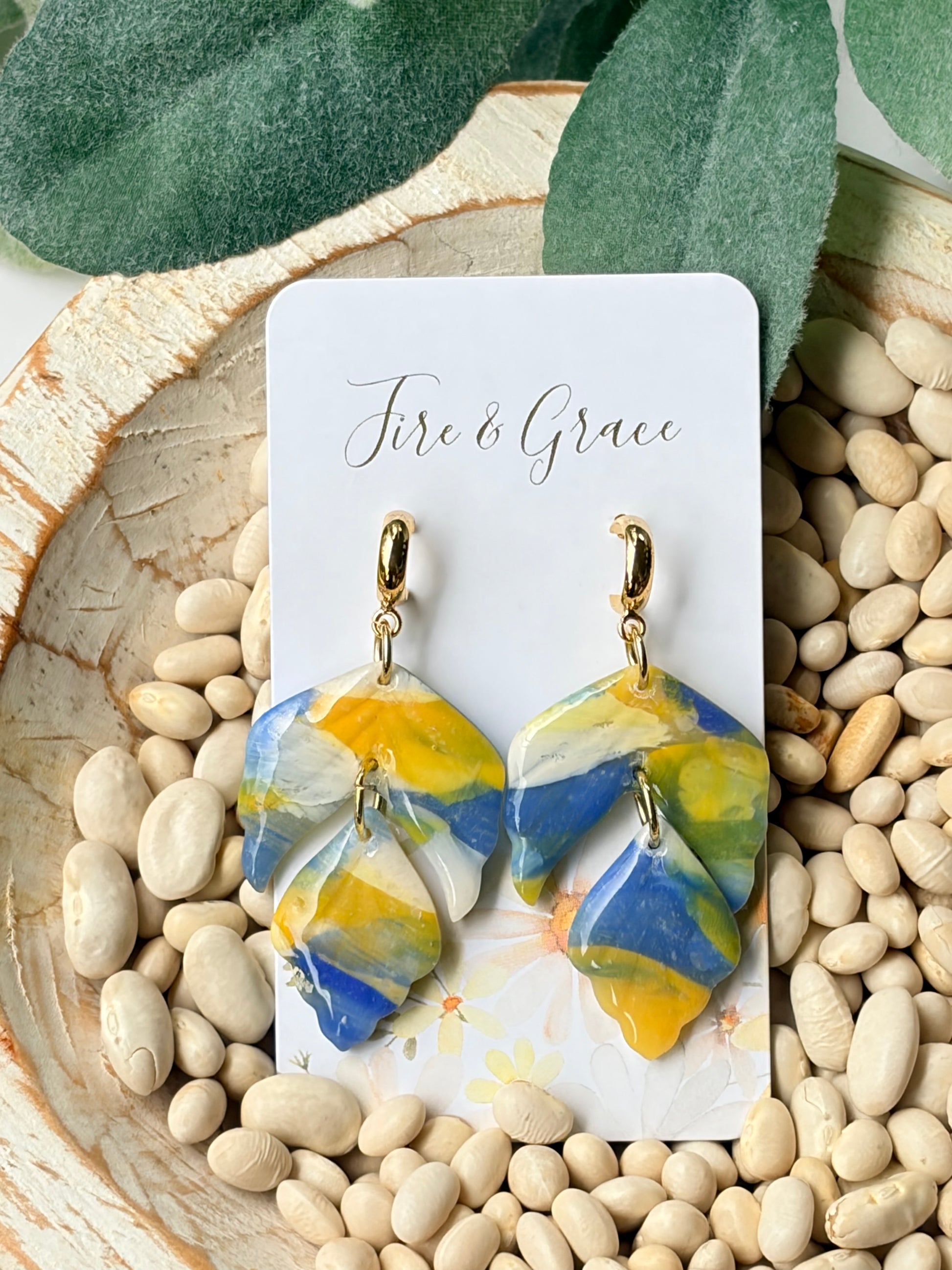 The Blue and Gold Dangle earrings showcase carefully handmade polymer clay art paired with refined gold toppers. Designed for both durability and comfort, these earrings are an excellent choice for school-sponsored events, offering a subtle yet sophisticated accessory to complement your attire.