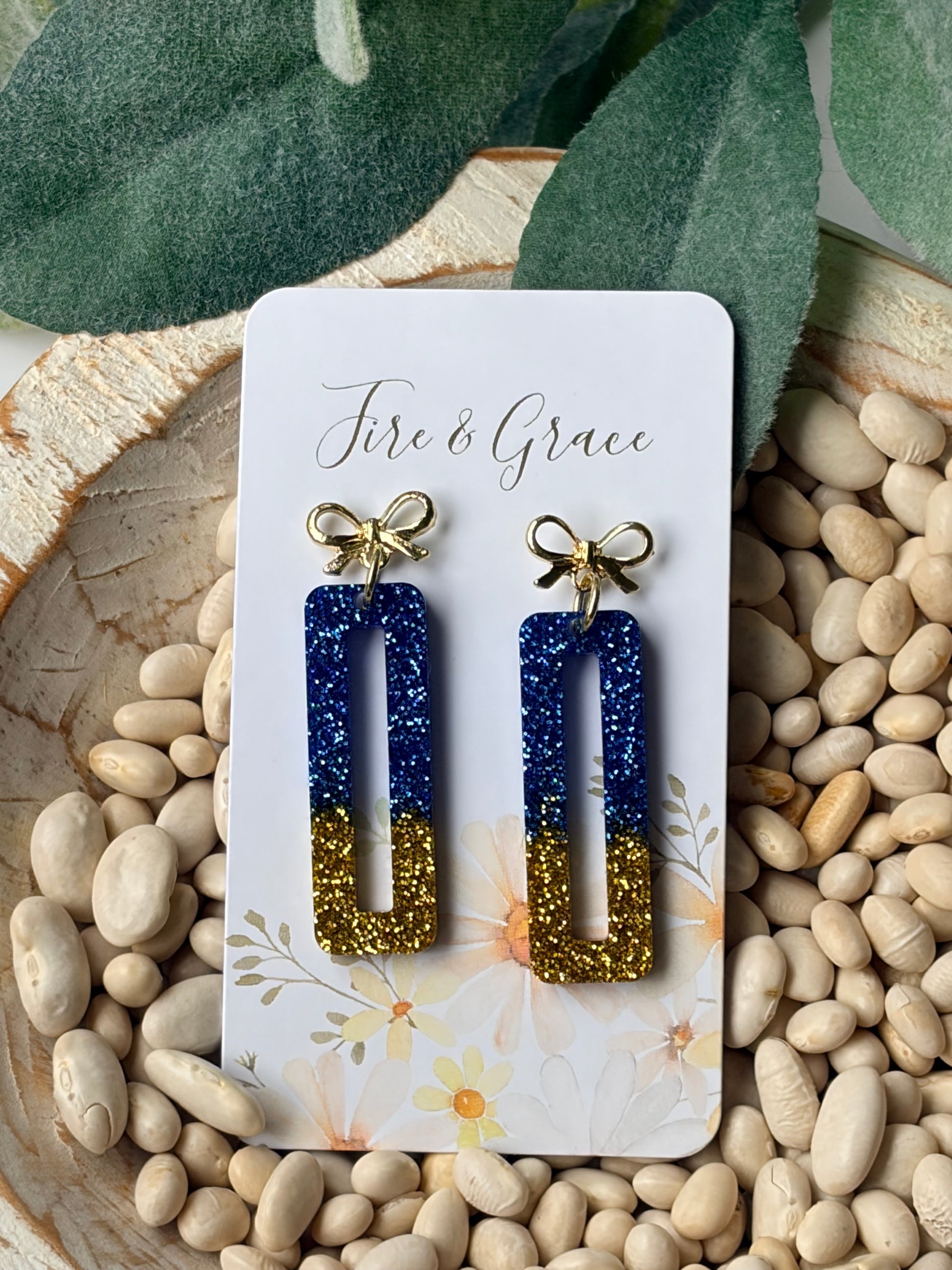 These handmade resin earrings combine deep blue with gold sparkle, offering a refined accessory perfect for school events or showing support as a sports fan. Each pair is crafted with care, providing a unique, durable design that complements team colors while maintaining an elegant finish.