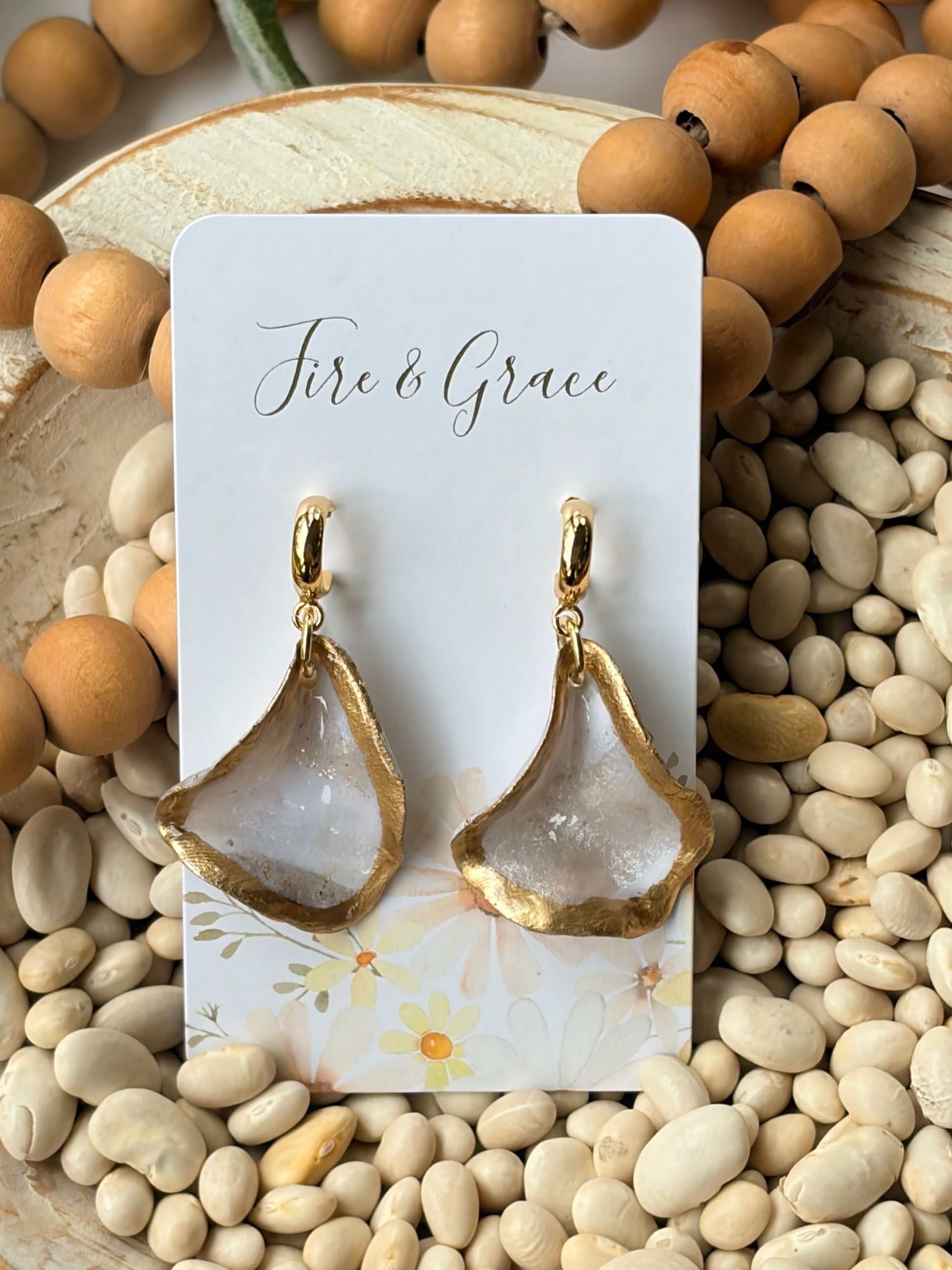 Handcrafted from polymer clay, the LA Oyster earring captures the natural beauty of an oyster shell with exceptional detail. Enhanced by a delicate gold leaf trim, each piece is uniquely crafted, making it a one-of-a-kind accessory.