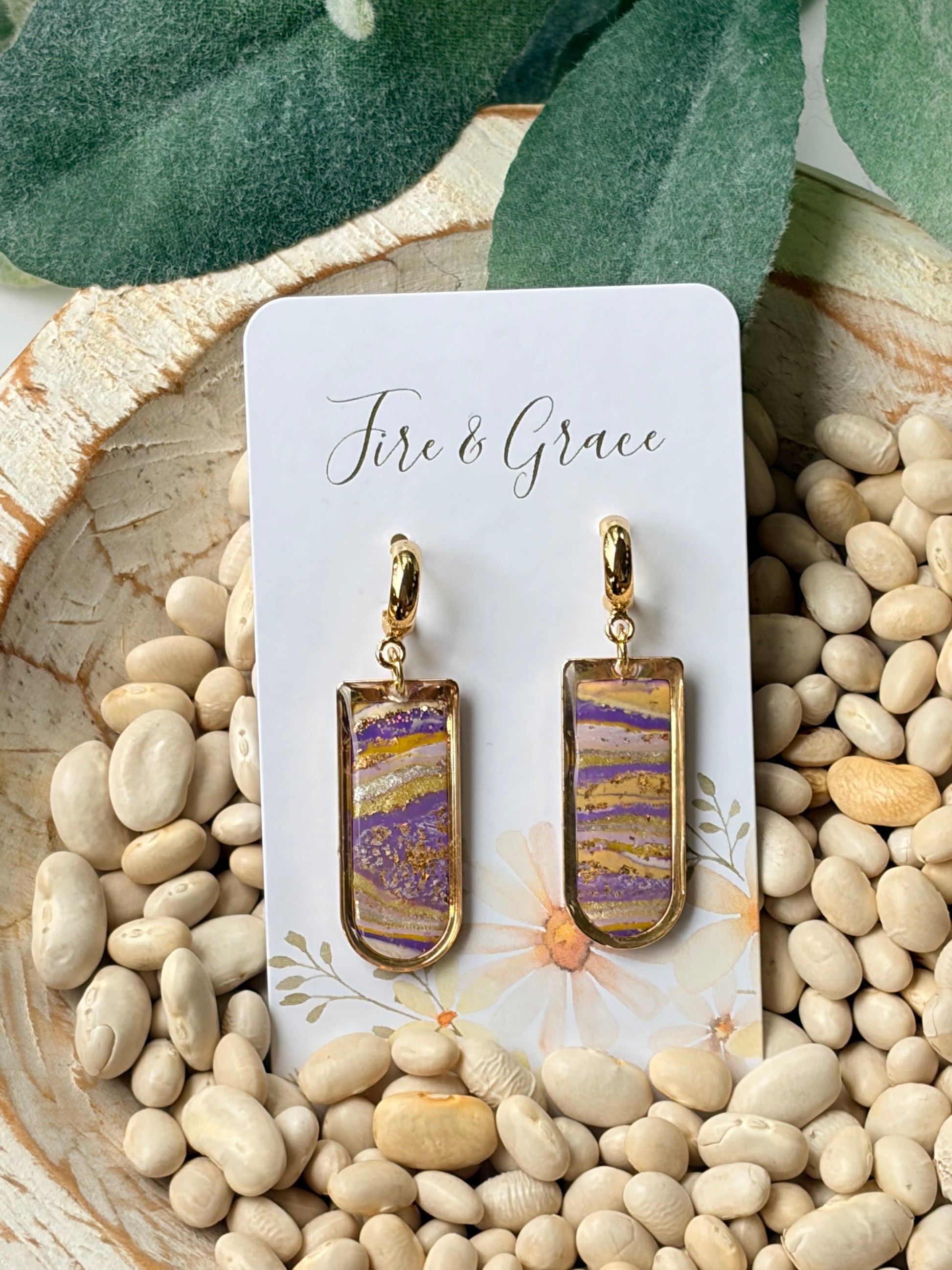 The Purple and Gold Stripe earrings showcase carefully handmade polymer clay art paired with refined gold toppers. Designed for both durability and comfort, these earrings are an excellent choice for school-sponsored events, offering a subtle yet sophisticated accessory to complement your attire.