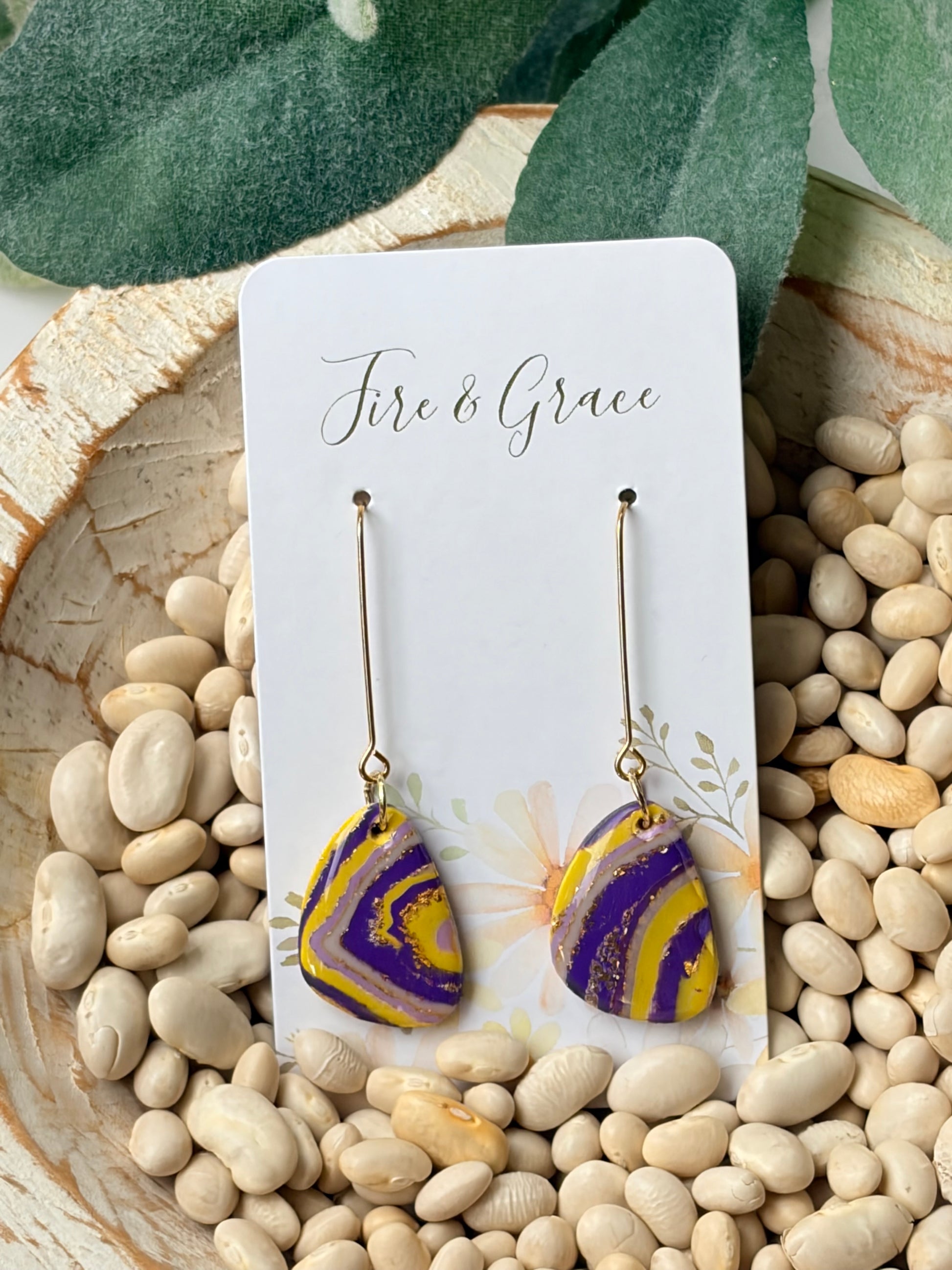 The Purple and Gold Swirl earrings showcase carefully handmade polymer clay art paired with refined gold toppers. Designed for both durability and comfort, these earrings are an excellent choice for school-sponsored events, offering a subtle yet sophisticated accessory to complement your attire.